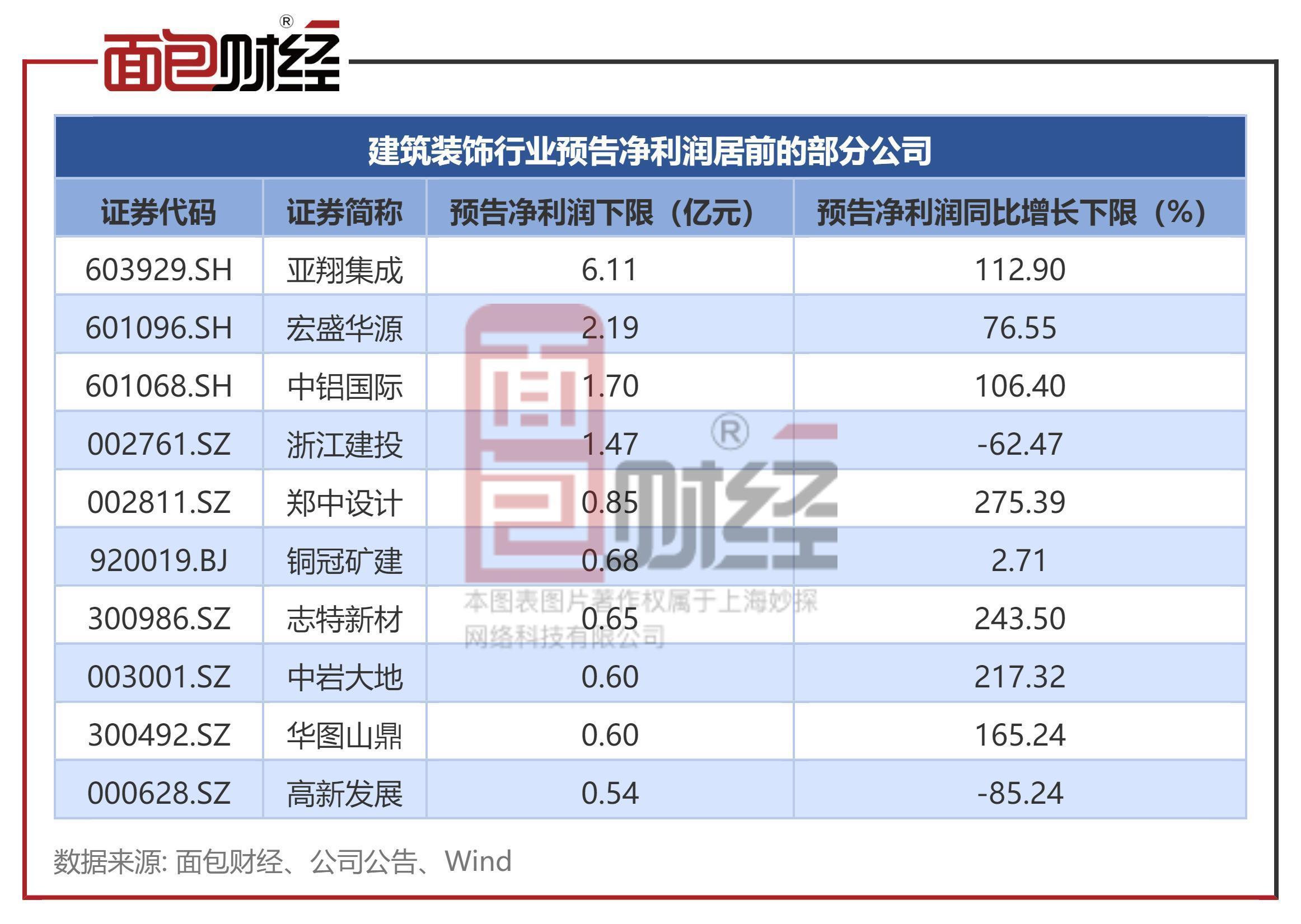 数据显示,亚翔集成、宏盛华源及中铝国际的预告净利润规模下限位列前三。